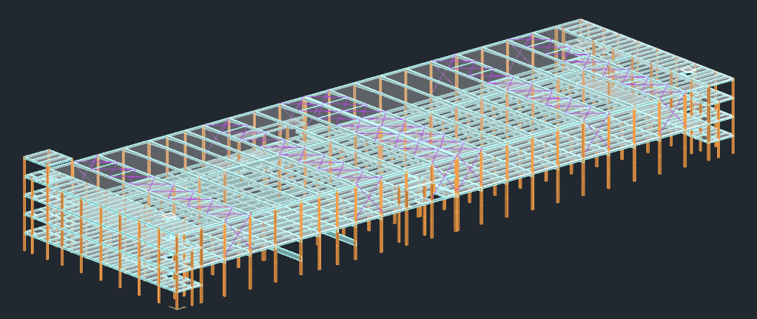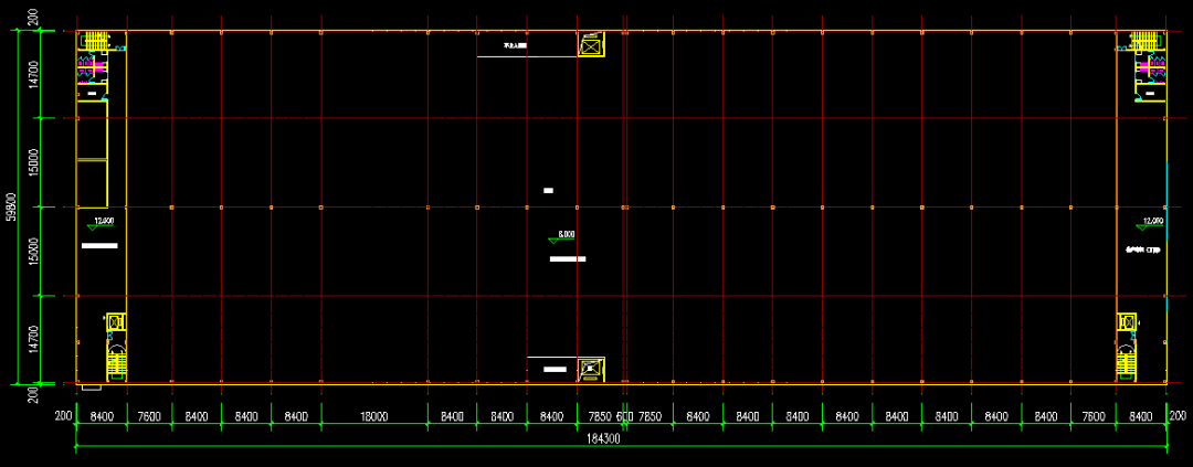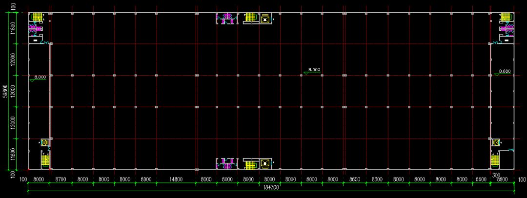 業主最初考慮的設計方案為多層砼框架廠房,如下圖所示,首層主要柱距為8m,跨度為12m×5,首層層高8m;二層抽掉兩排柱,中間主體采用輕鋼屋面,跨度為24m+12m+24m,原方案預估平米造價費用約1700~1800元/m2。業主對砼結構項目建設經驗較為豐富,但本項目層高較高,業主對采用砼結構的高支模費用始終存疑;與我院探討該項目時,業主并未對我方表達對高支模費用的顧慮,但我院技術團隊在分析此項目首先點出就是高支模費用的問題,建議業主采用免支撐全裝配多層鋼結構廠房設計方案。