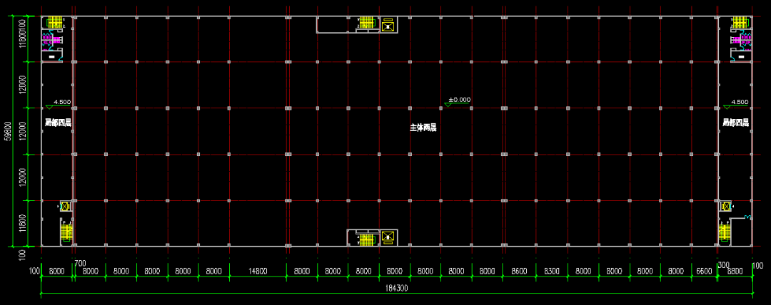我們對柱網進行了優化,首層主要柱距為8.4m,跨度為15m×4,首層層高8m;二層抽掉兩排柱,跨度為30m+30m,東西兩端跨為四層鋼框架。